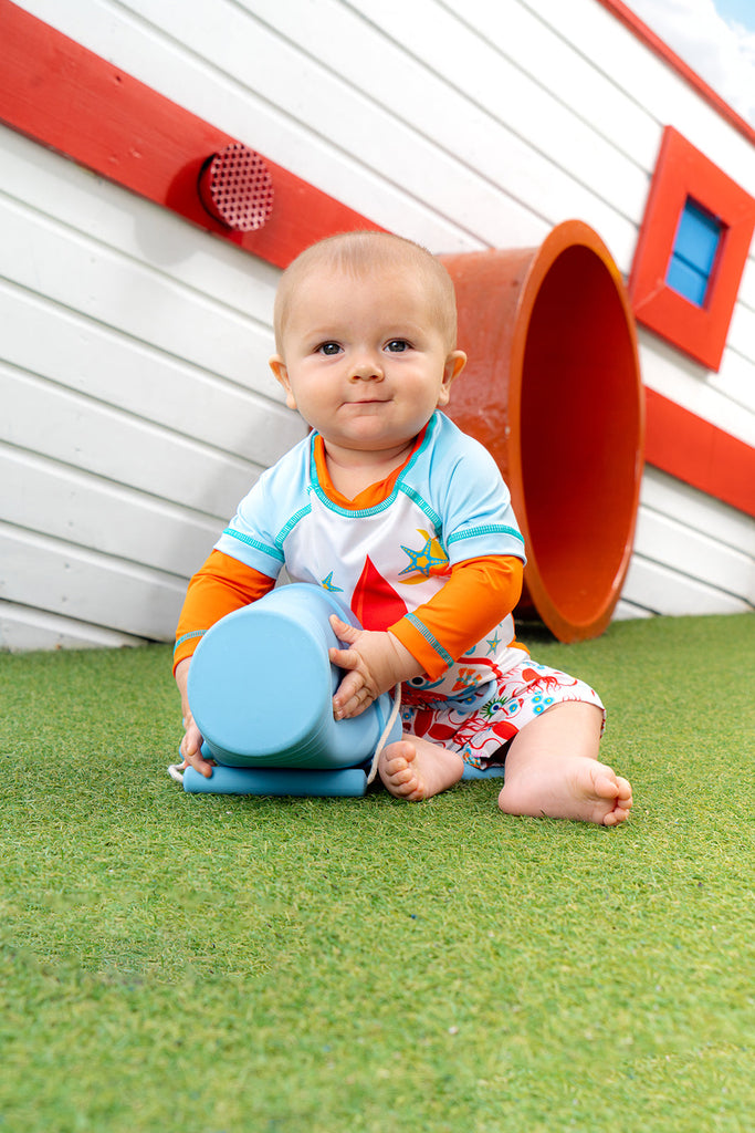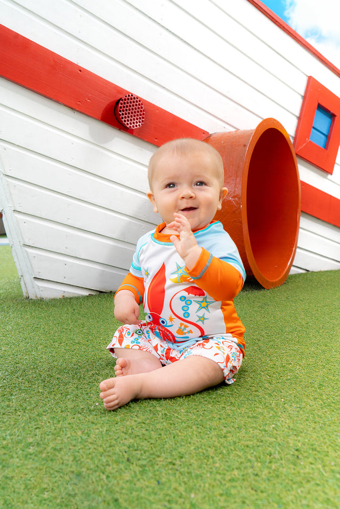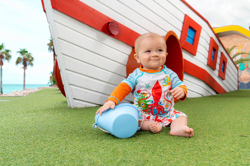 La camiseta de baño manga larga de la colección Pélican Marin es un traje de baño con protección UV hecho de material respirable, con protección solar UPF 50+ que bloquea el 97% de los rayos solares dañinos. Un look moderno perfecto para las aventuras de tus niños.
