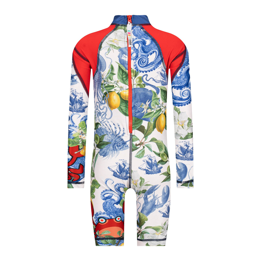 El traje de baño de una pieza manga larga "cangrejo" es un traje de baño con protección UV hecho de material respirable, con protección solar UPF 50+ que bloquea el 97% de los rayos solares dañinos. El largo del traje de baño es hasta encima de la rodilla. Un look moderno perfecto para las aventuras de tus pequeños