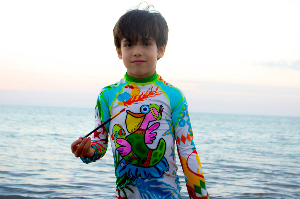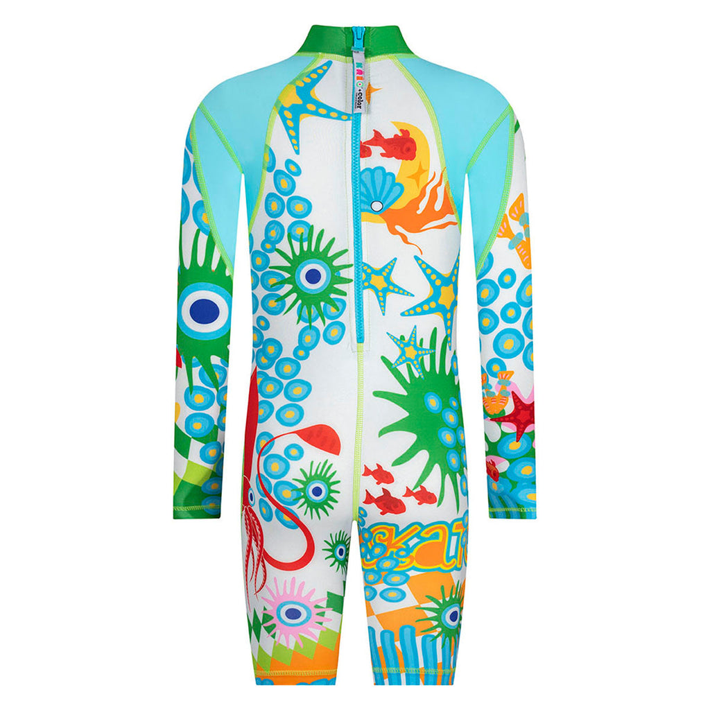 El traje de baño de una pieza manga larga "Pélican Marin" es un traje de baño con protección UV hecho de poliéster reciclado, material respirable, con protección solar PFS 50+ que bloquea el 97% de los rayos solares dañinos. El largo del traje de baño es hasta encima de la rodilla. Un look moderno perfecto para las aventuras de tus niños.